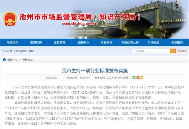 恒生集團多年來致力于管道搶修安裝領域的技術與裝備研發(fā),并已發(fā)展成為集微電子、機械、化工及彈性體密封件制造等為一體,擁有多家控股子公司的多元化、現代化企業。恒生集團是“安徽省高新技術企業”和“國家知識產權優(yōu)勢企業”,是多種材料標準的主要起草單位,2015年國家工信部批準了由恒生集團主持起草《管道用球墨鑄鐵修補器》的國家行業標準,該標準將于2018年9月開始實施,這對引導國內管道修補器行業的發(fā)展有著積極而深遠的意義。